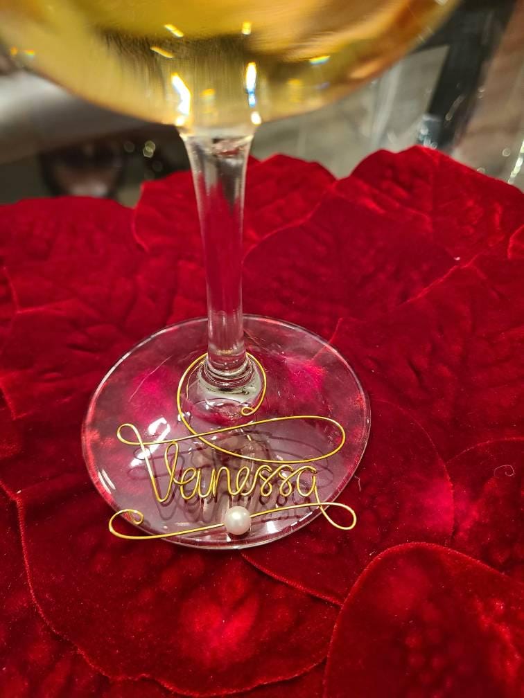 Size of each personalized charm will vary by name approximately 1 1/2" to 2". For reference, the base of the wine glass in photos is 2 1/4".